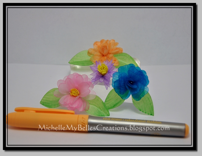 I cut the files out of vellum and colored with my Bic Markers. I think they turned out so pretty, like watercolors. When coloring them, I laid the point flat on it's side and made a swiping motion. I overlapped the stroke a bit to make it look like veins in the leaf and the flower. I also glued them in random spots as I was rolling them, just to give them a little more stability. I made sure they were dry, maybe 2 hours before I started shaping the petals. Be careful when shaping, you don't want to rip them.